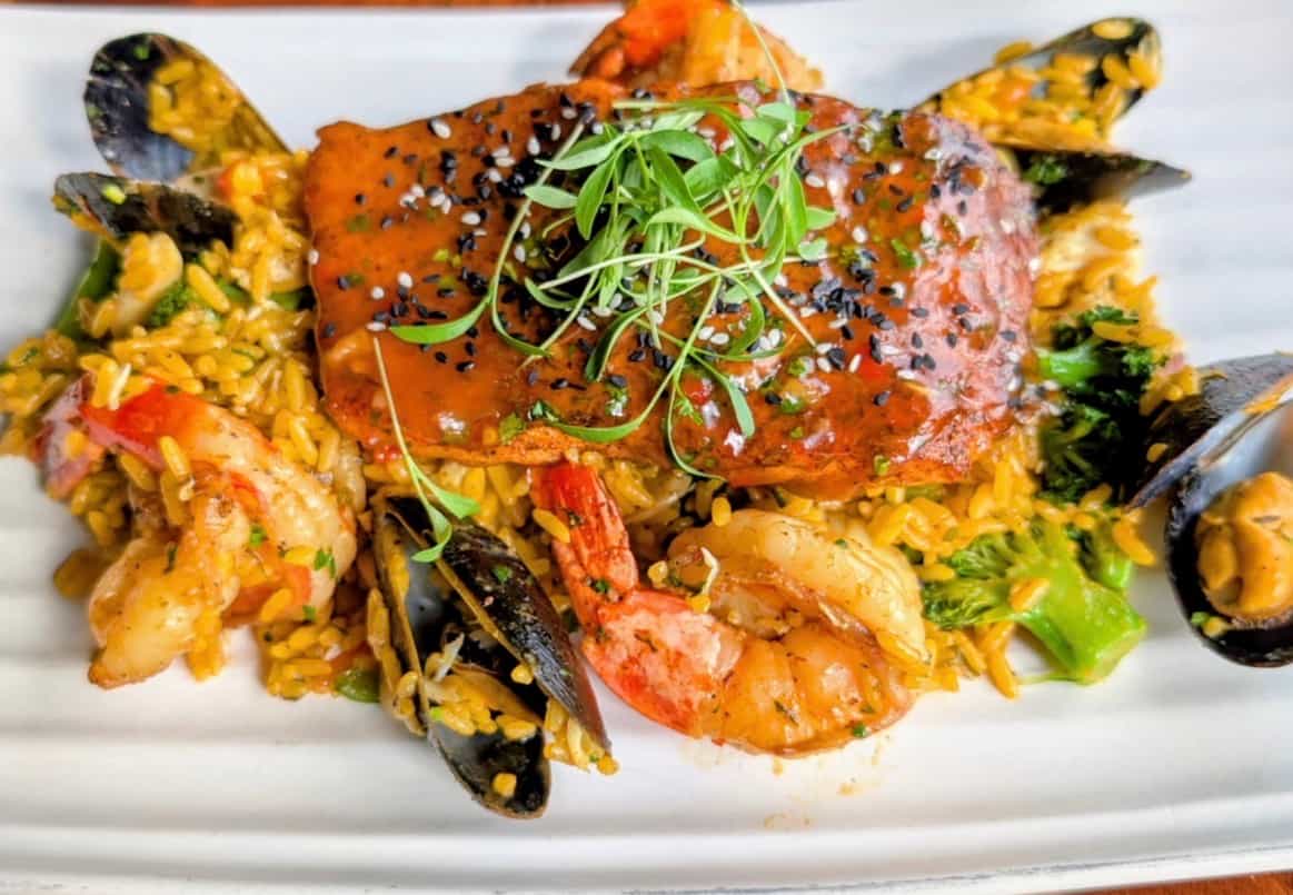 Miso chili glazed salmon over saffron seafood rice with shrimp, crab, mussels, and broccoli.